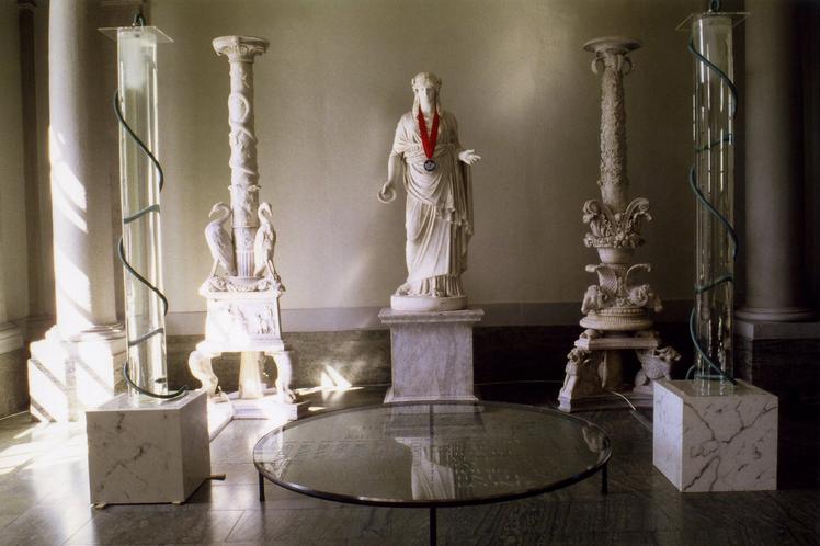 Sandblasted glass diam 180 cm, cast iron support h 30 cm, 2 Plexiglas columns, h 200 cm, diam 20 cm, 120 l water, 2 electric pumps, PVC-hose, base 50 x 50 x 50 cm, medals for sculptures made of laser engraved oxidized aluminium, red silk ribbons