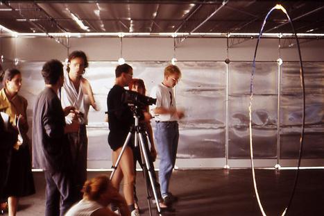 11 Plexiglas columns, h 180 cm, diam 18 cm, stainless steel, sandblasted glass, diam 180 cm, 2 aluminium globes, diam 100 cm, 100 l water, electric pump, total size 8 x 6 x 5 m