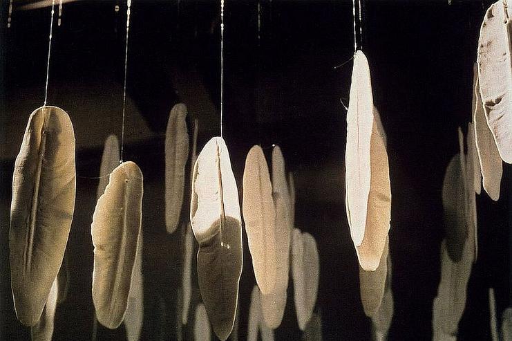 Interactive sound installation, 4000 feathers made of unglazed porcelain, each approx 2 x 8 x 0.1 cm, cotton threads