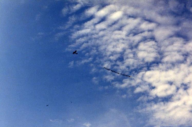 Poster campaign in Stockholm and performance with bread, pigeons, airplane in front of and above Sweden's parliament