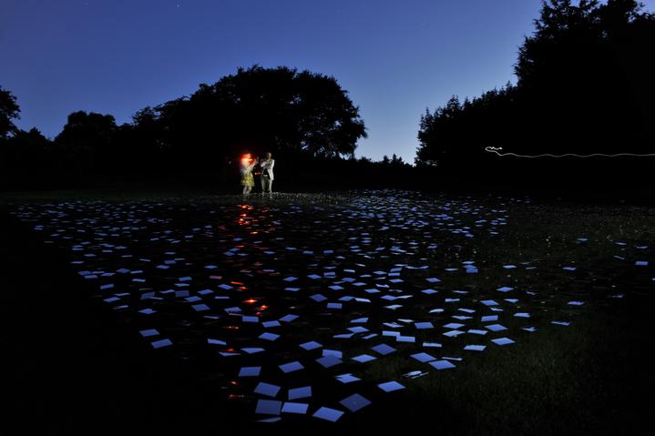 1500 wings of white paper create a new sound and light environment in the prairie, wind and rain dissolve the installation within a week, each wing approx 10 x 5 cm,