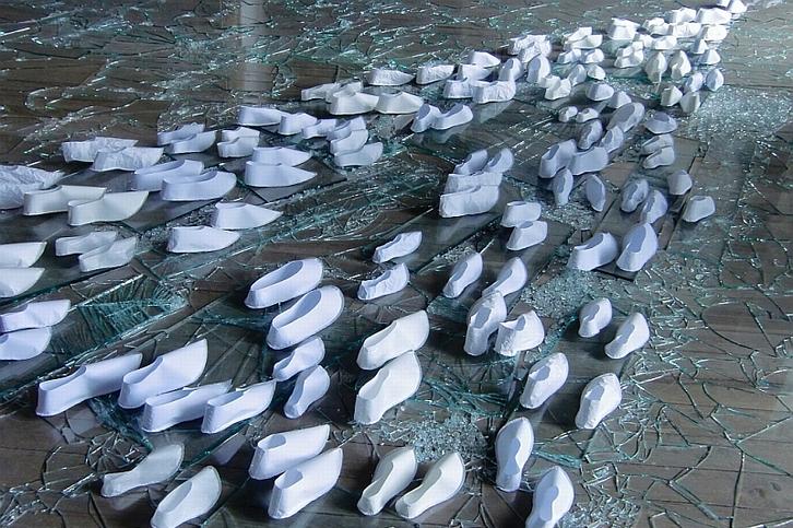 200 shoes made of white paper and cotton thread, each with size variable, approx 26 x 12 10 cm, 36 sq.m broken glass