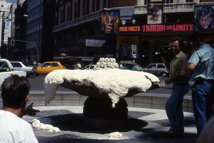 250 kg bread-dough in the fountain, growing and changing shape under the sun, duration one day, Plaza Callao, Madrid, Spain