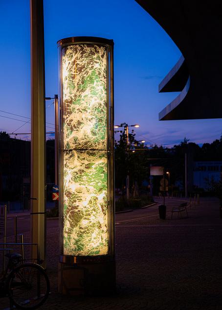 Image on transparency, Plexiglas, LED-lights, metal, concrete, H 4,2 m diam 1 m