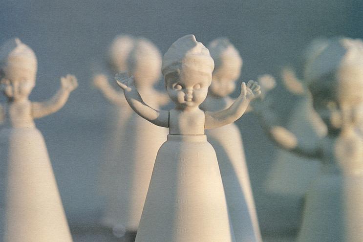 Kinetic sound installation, 20 objects of unglazed porcelain, 20 dildos, cables, transformer, electric power