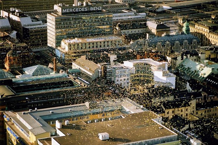 50 000 paper leaves with the text "guilty" or "not guilty" thrown out of a helicopter over Sergels torg, Stockholm, Sweden